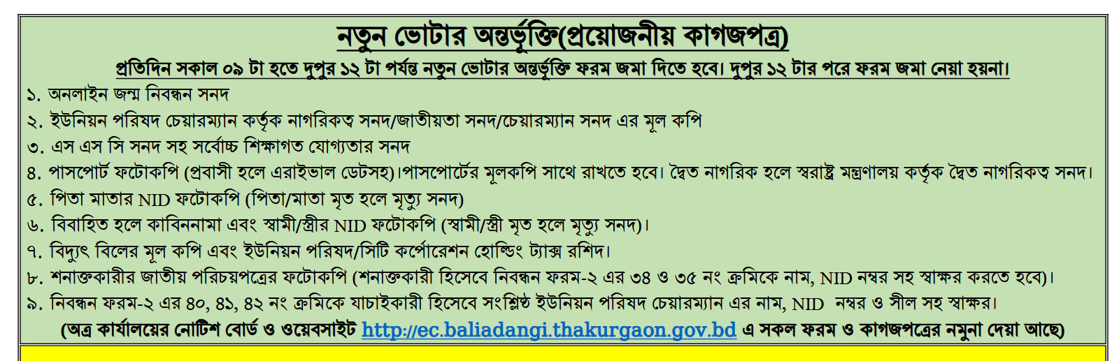 | ১. অনলাইনে (//services.nidw.gov.bd/nid-pub/register-account) এই লিংক এ নির্ধারিত” ফরম-২” পুরণ করে উপজেলা নির্বাচন অফিসার বরাবর আবেদনপত্র দাখিল করতে হবে। ২. প্রতিদিন সকাল ০৯ টা হতে দুপুর ১২ টা পর্যন্ত নতুন ভোটার অন্তর্ভূক্তি ফরম জমা দিতে হবে। দুপুর ১২ টার পরে ফরম জমা নেয়া হয়না। | |