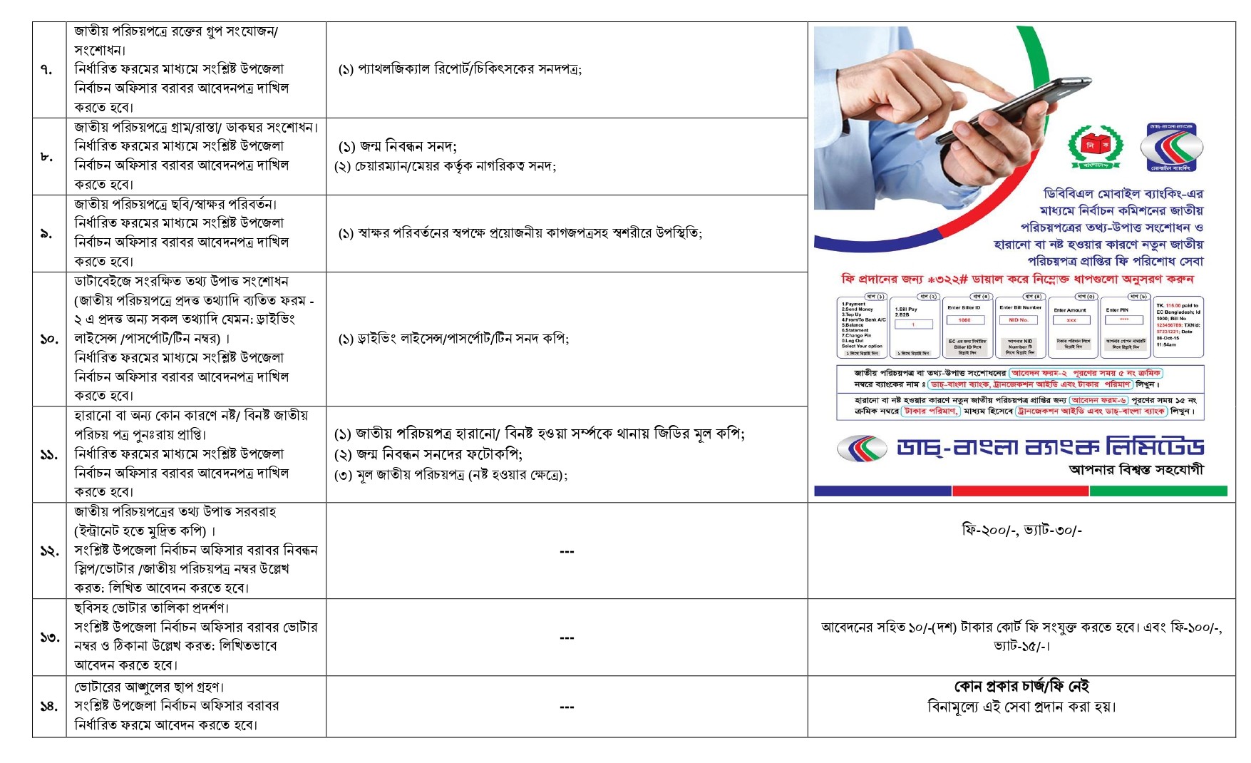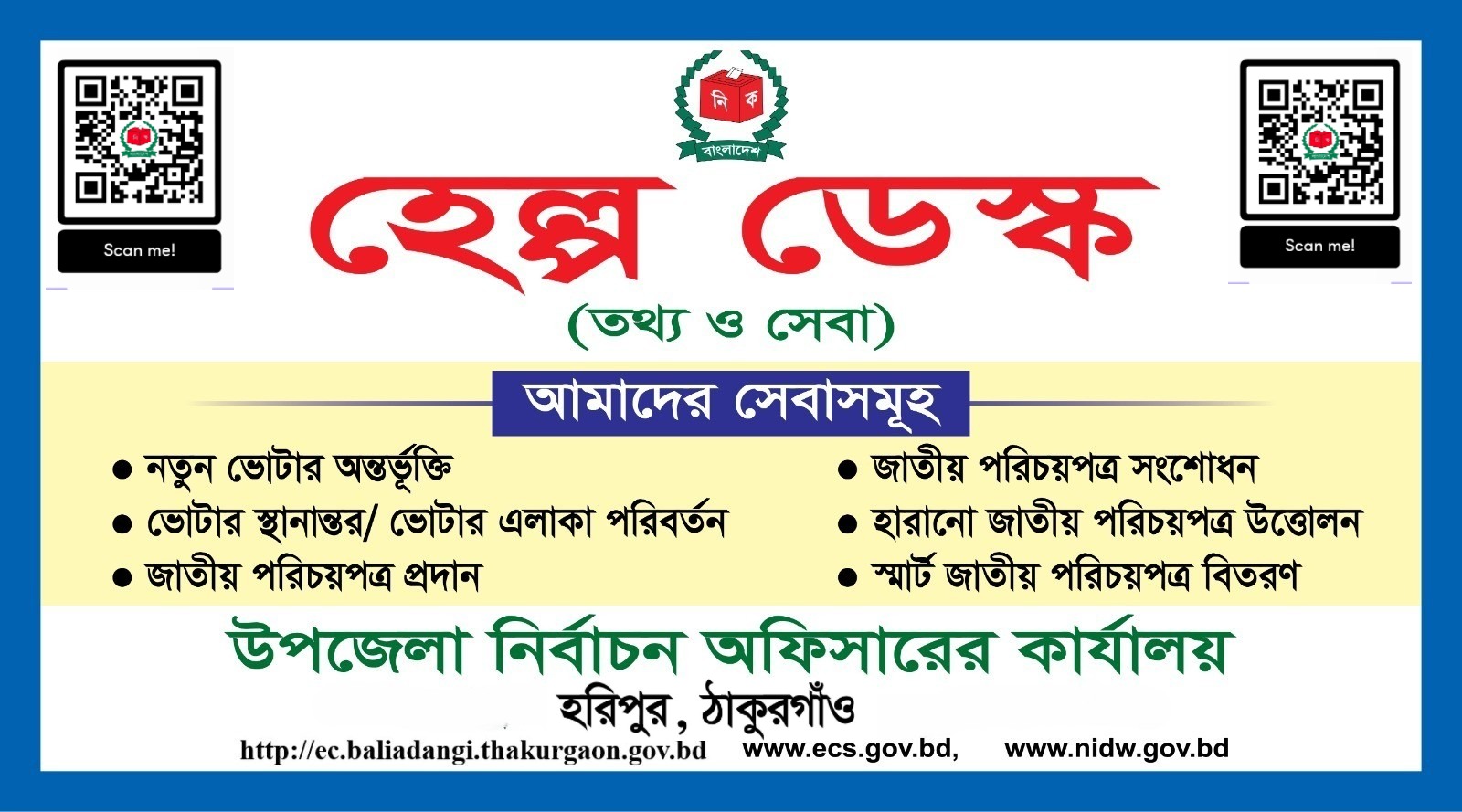 | আমাদের সেবা সমূহঃ ১. নতুন ভোটার নিবন্ধন (অনলাইন আবেদনের লিংক-https://services.nidw.gov.bd/nid-pub/register-account) ২. ভোটার এলাকা স্থানান্তর (আবেদনকারী স্বশরীরে উপস্থিত হয়ে আবেদন করতে হবে) ৩. জাতীয় পরিচয়পত্র সংশোধন (অনলাইন আবেদনের লিংক-http://services.nidw.gov.bd/nid-pub/register-account) ৪. হারানো এন.আই.ডি কার্ড পুনঃমুদ্রণ আবেদন (অনলাইন আবেদনের লিংক-https://services.nidw.gov.bd/nid-pub/claim-account) ৫. স্মার্ট জাতীয় পরিচয়পত্র প্রদান ও বিতরণ (অনলাইন আবেদনের লিংক-http://services.nidw.gov.bd/nid-pub/card-status) |